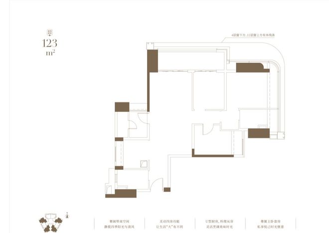 建面123㎡户型,灵动四房,U型厨房设计,料理从容,尊属主卧套房,私享悦已时光。