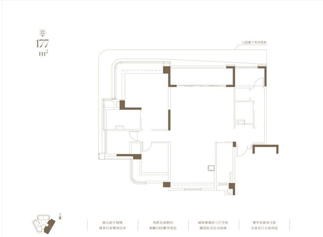 建面177㎡户型,纯粹东南朝向,俯瞰CBD繁华景色,奢华双套房主卧,尽显名门大家风范。